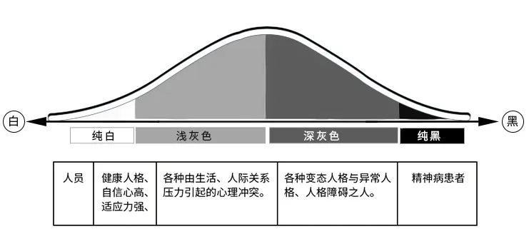 如果將人的心理正常比作白色,心理不正常比作黑色,那么在白色與黑色之間存在著一個巨大的緩沖區(qū)域--灰色區(qū)域。我們絕大部分人的心理健康狀況都處在中間的灰色區(qū)域,也就是說絕大部分人都有這樣或那樣的心理健康問題,如果盡早進行心理干預(yù),很大程度上可以避免精神疾病的發(fā)生。