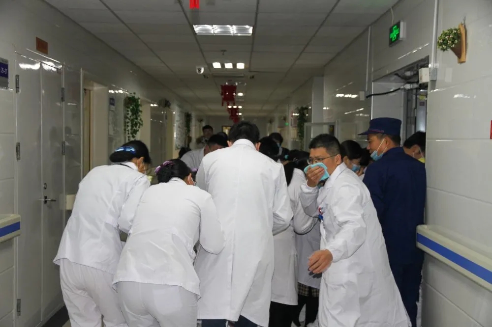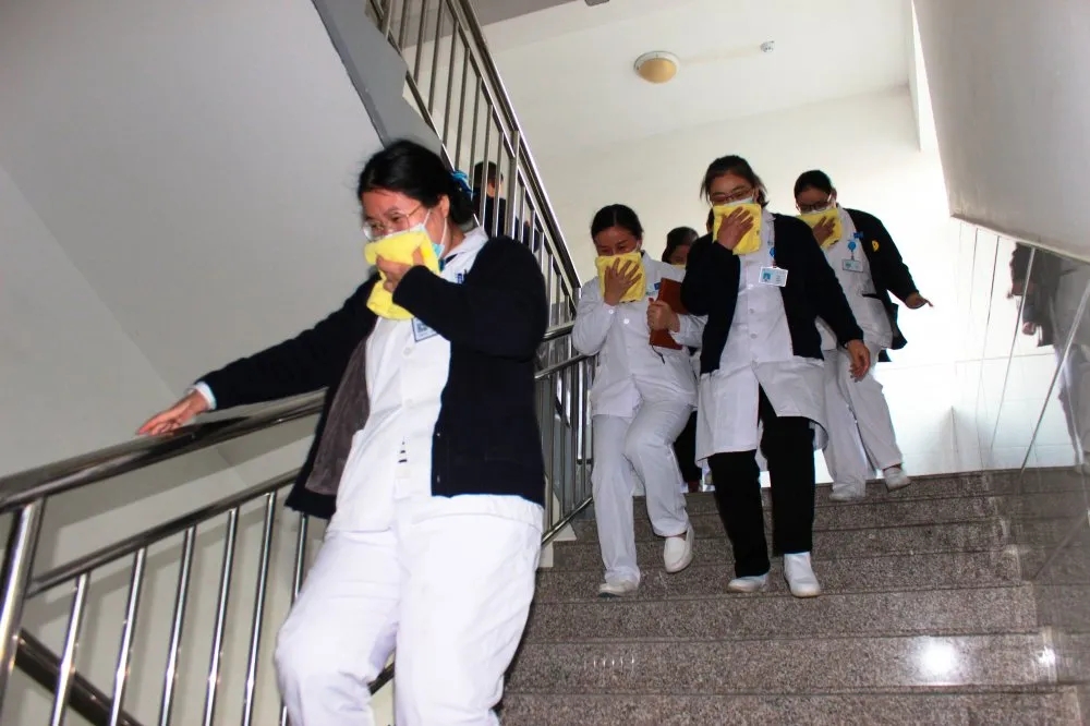 隨后,在住院部五樓開展了疏散逃生演練,模擬局部發(fā)生火災,病區(qū)人員用毛巾捂住口鼻,俯姿前行,有序疏散至安全區(qū)。經過緊張有序的操作,所有人員都疏散到安全區(qū),演練取得圓滿成功。